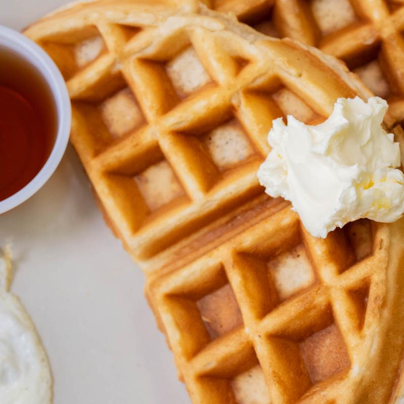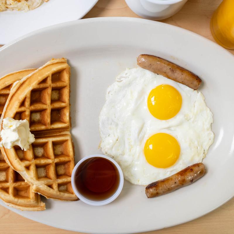 Waffle, Two Eggs, Bacon or Sausage, Hash browns or Red Skin Potatoes