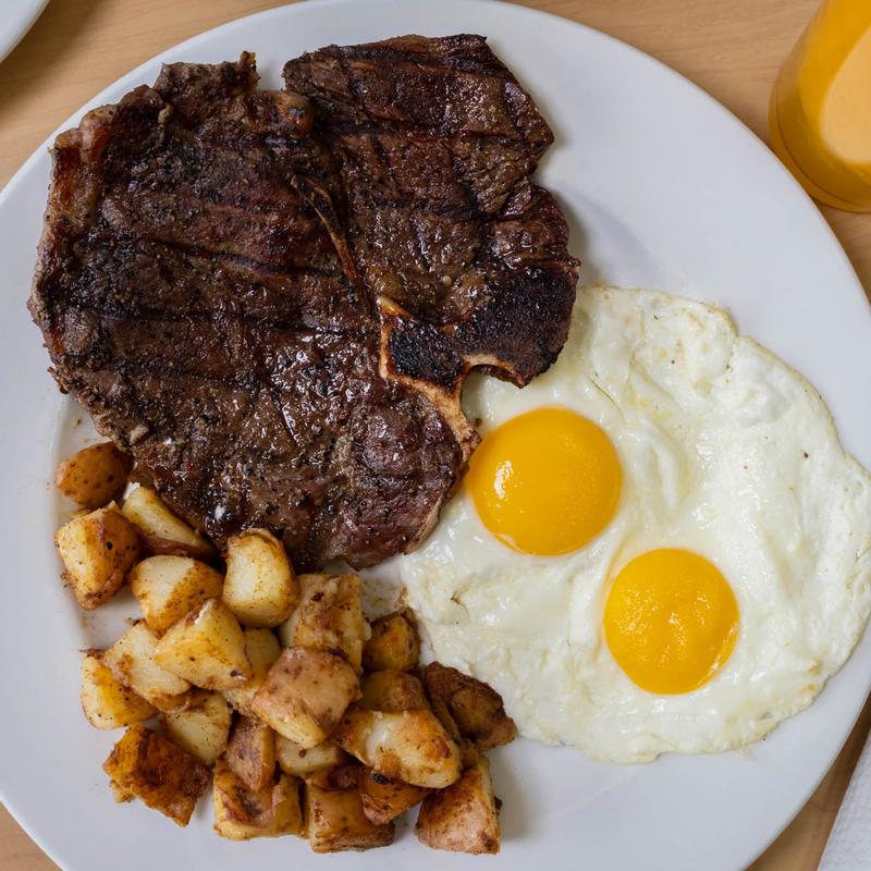 T-Bone Steak with Two Eggs, Red Skinned Potatoes or Hash Browns and Toast