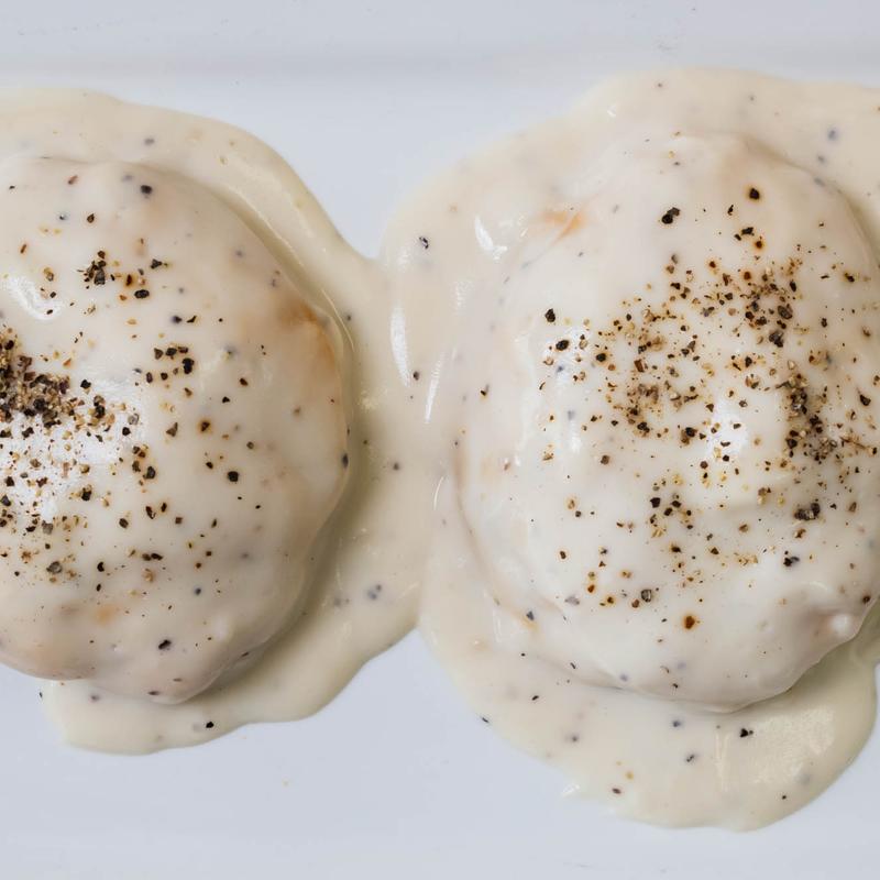 Two Biscuits with Home-Made Gravy and Two Eggs