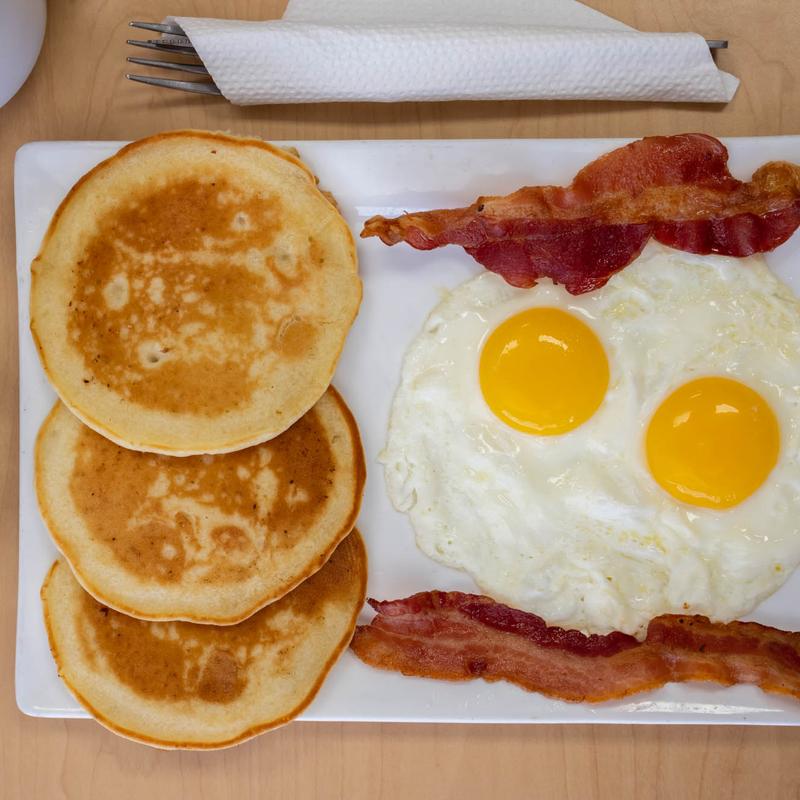 Three Pancakes, Two Eggs, Bacon or Sausage, Red Skin Potatoes or Hash Brown