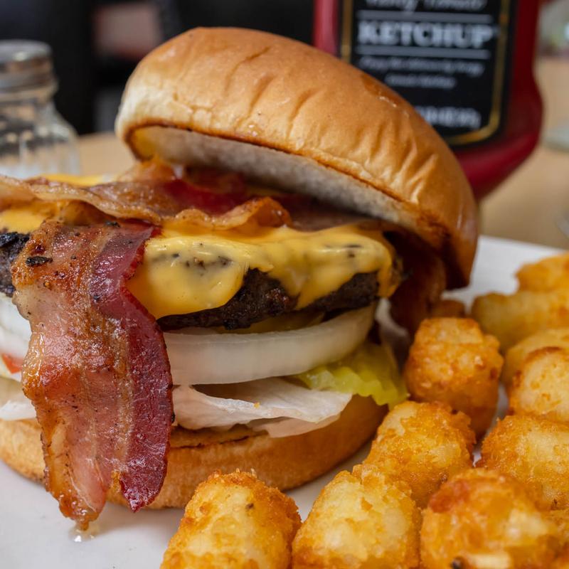 Hamburger topped with cheese and bacon. Broiled, roasted, or grilled