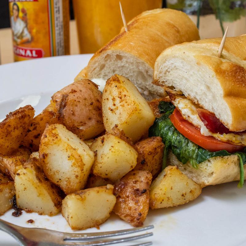 Eggs, Cheese, Bacon, Spinach, Avocado, Tomato and Mayo in Sandwich. Served with Red-Skinned Potatoes or Hash browns.