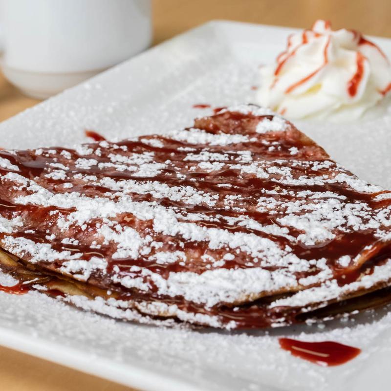 Strawberry Flavored Crepe with Two Eggs, Bacon or Sausage, and Red Skin Potatoes or Hashbrowns